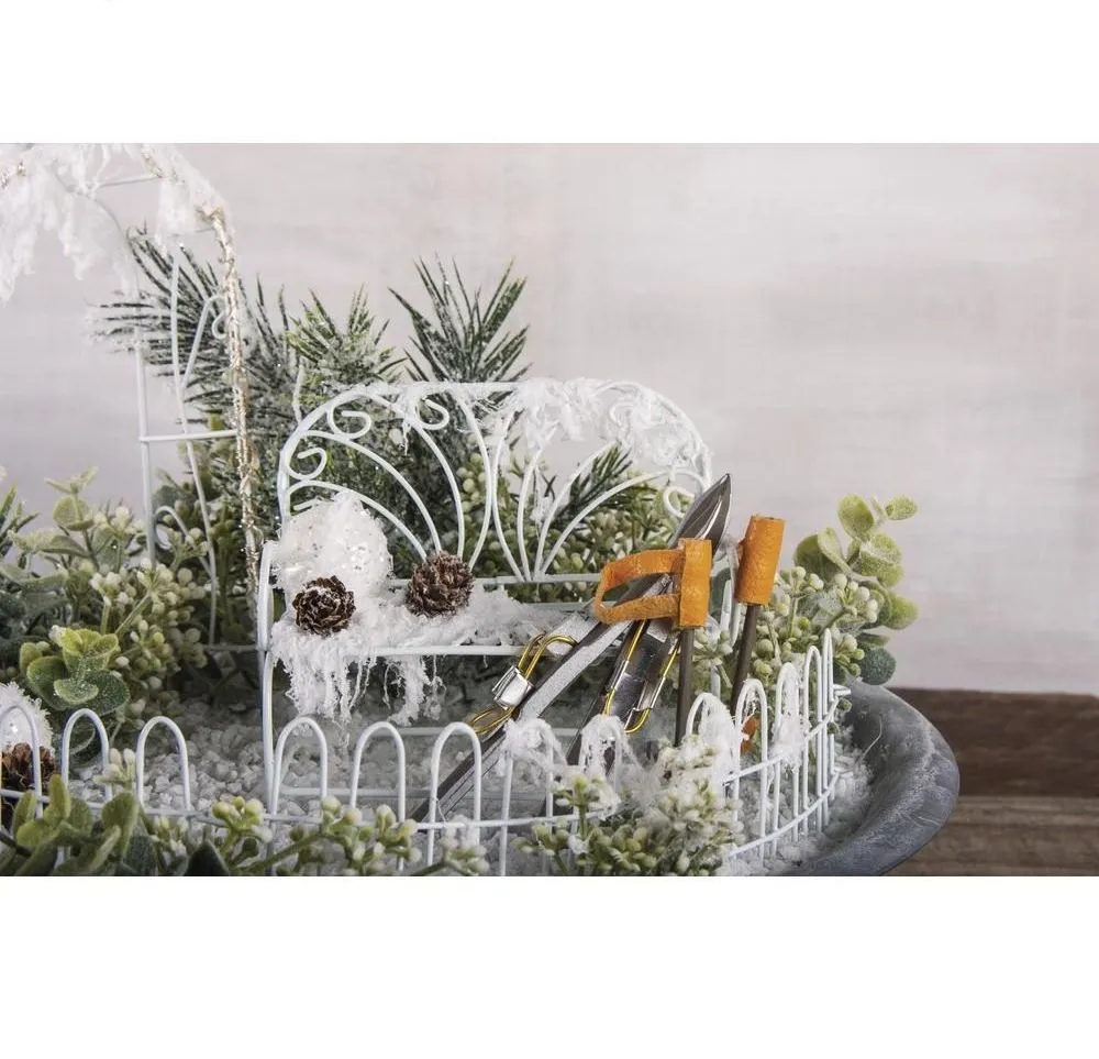Dekoracyjna metalowa ławeczka z ozdobnym oparciem i siedziskiem będzie idealnym akcentem w doniczce pomiędzy zielonymi roślinami.