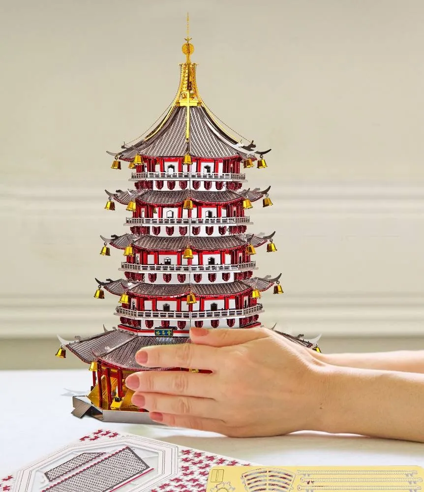 Ośmiokątna 5-piętrowa pagoda Leifeng została zbudowana w 975 r. na polecenie króla Qian Chu z Wuyue. Choć oryginał zbudowano z drewna, na bazie cegieł, to obecna wersja została zbudowana w 1999 roku na miejscu oryginału, który zawalił się w 1924 roku, przy użyciu stali i miedzi. Zestaw modeli Piececool wykorzystuje elementy z mosiądzu i stali, aby stworzyć jeden z naszych najtrudniejszych modeli, który po zakończeniu będzie miał 23 cm (9 cali) wysokości.