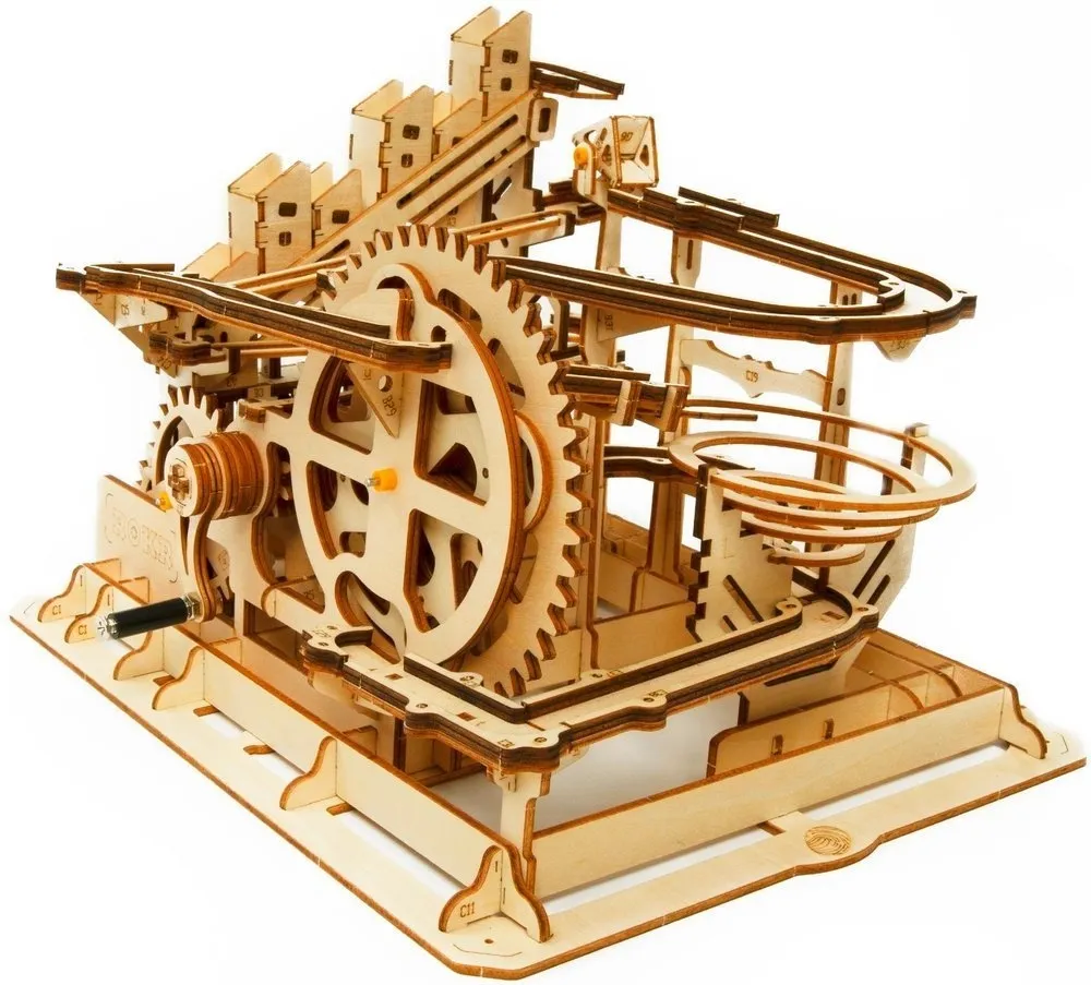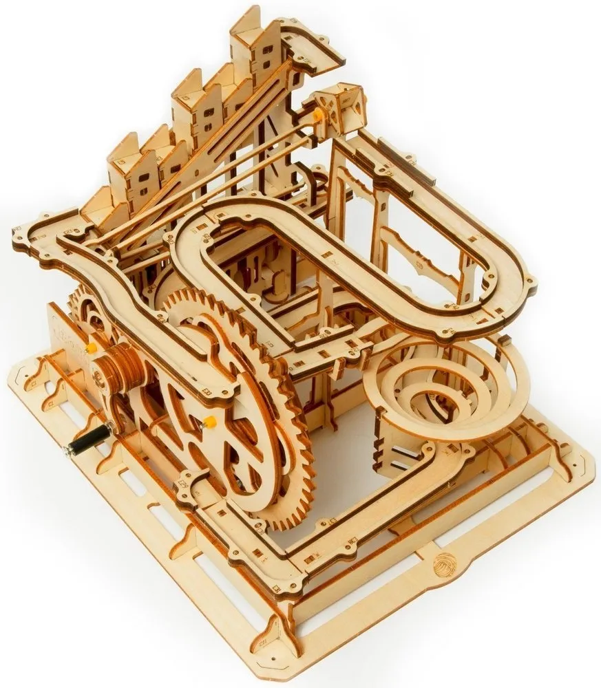Zbuduj swój własny tor z drewnianych elementów i obserwuj jak kulki pokonują ten skomplikowany system kół zębatych i zakrętów.
